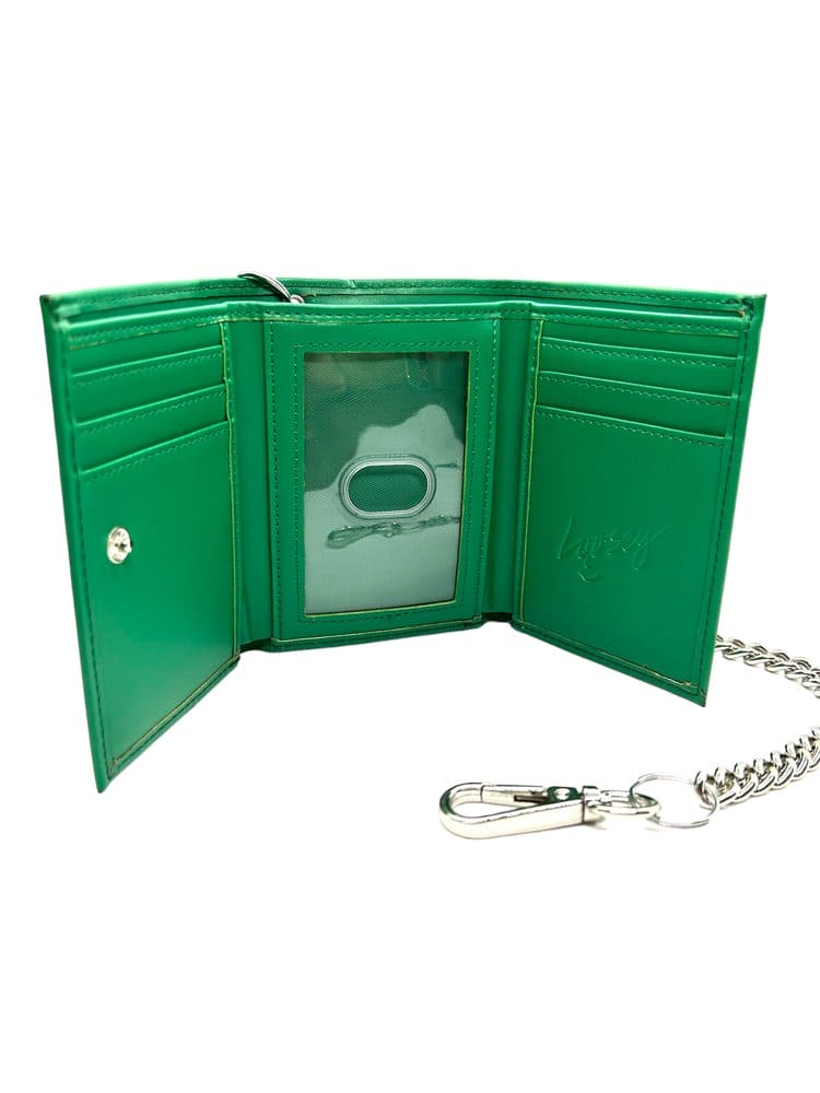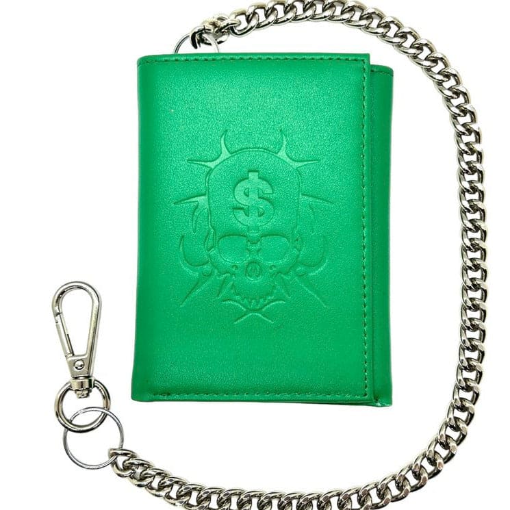Tri-fold green faux leather chain wallet with embossed money skull and snap closure. Never lose your cold hard cash again or debit card…