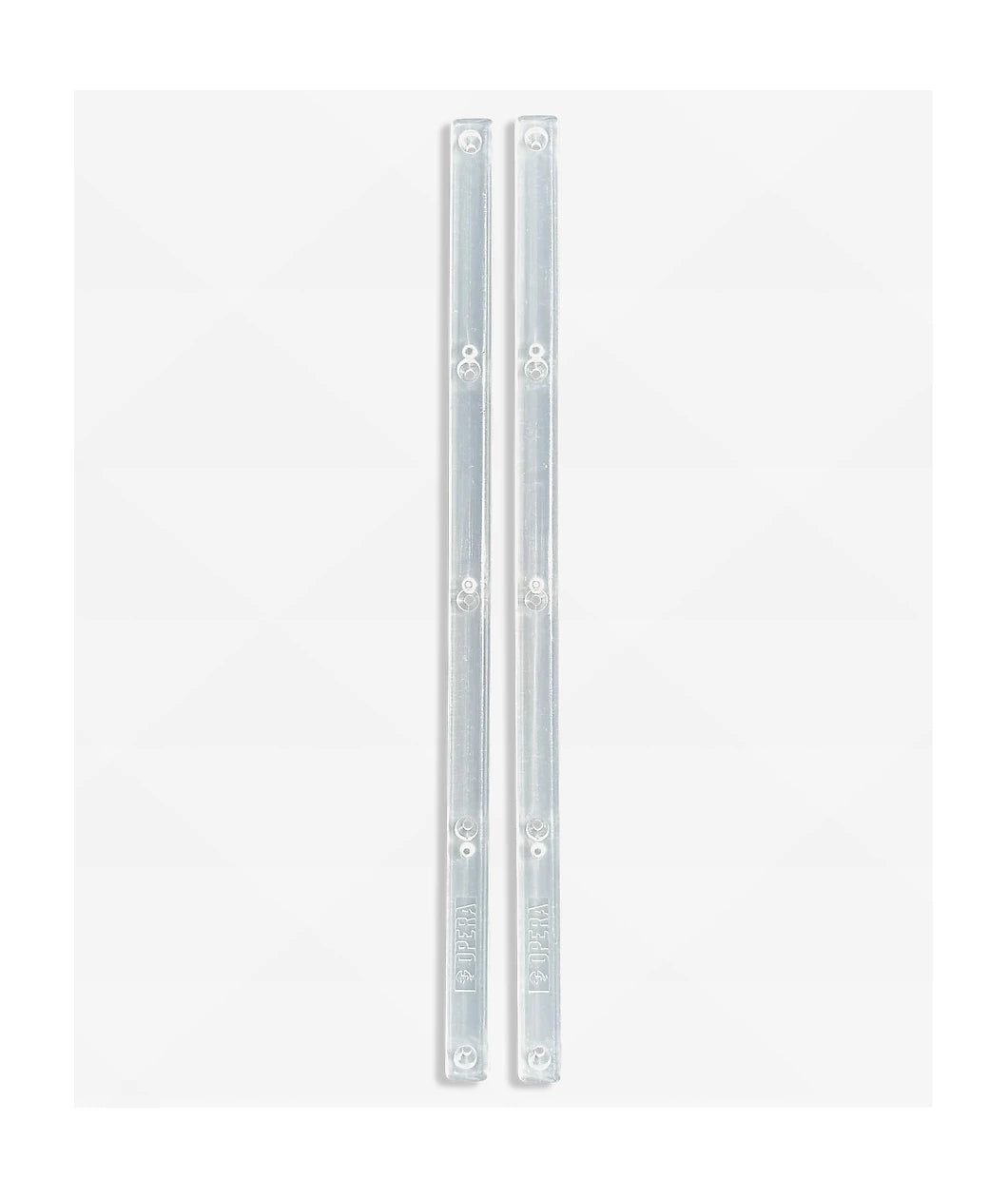 Make any unwaxed ledge, curb or rail slide for miles with the clear Rails from Opera, including two 14.5" long Rails in each pack. With a peel-and-stick backing for placement and five pre-bored screw holes in each Rail to securely fasten to the bottom ply of any board, the slippery skate accessories feature a clear polyethylene construction that protects a graphic without obstructing the view.